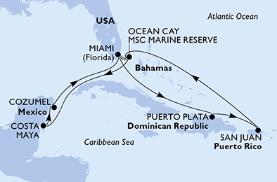 Miami > Puerto Plata > San Juan > Ocean Cay > Miami > Ocean Cay > Costa Maya > Cozumel > Miami