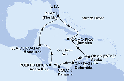 Miami > Ocho Rios > Oranjestad > Cartagena > Colon > Puerto Limon > Isla de Roatan > Miami