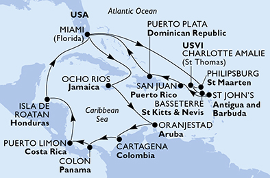 Miami > Ocho Rios > Oranjestad > Cartagena > Colon > Puerto Limon > Isla de Roatan > Miami > Philipsburg > Charlotte Amalie > Basseterre > St John s > San Juan > Puerto Plata > Miami