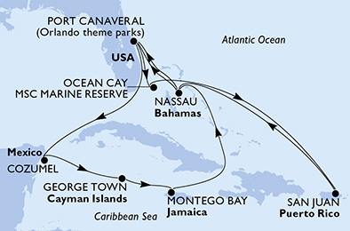 Port Canaveral > Cozumel > George Town > Montego Bay > Nassau > Port Canaveral > Ocean Cay > San Juan > Nassau > Port Canaveral