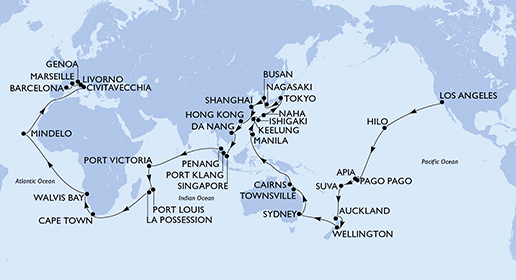Los Angeles > Hilo > Pago Pago > Apia > Suva > Auckland > Auckland > Wellington > Sydney > Sydney > Townsville > Cairns > Manila > Manila > Keelung > Ishigaki > Naha > Tokyo > Tokyo > Nagasaki > Busan > Shanghai > Hong Kong > Da Nang > Singapore > Port Klang > Penang > Port Victoria > Port Louis > Port Louis > La Possession > Cape Town > Cape Town > Walvis Bay > Mindelo > Civitavecchia > Livorno > Genoa > Marseille > Barcelona