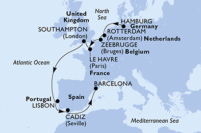 Hamburg > Rotterdam > Zeebrugge > Le Havre > Southampton > Lisbon > Cadiz > Barcelona