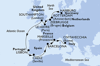 Hamburg > Rotterdam > Zeebrugge > Le Havre > Southampton > Lisbon > Cadiz > Barcelona > Marseille > Civitavecchia