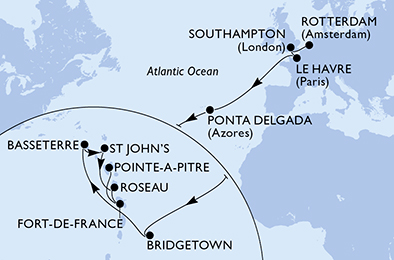 Rotterdam > Southampton > Le Havre > Ponta Delgada > Bridgetown > Basseterre > St John s > Roseau > Fort de France > Pointe-a-Pitre