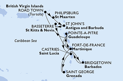 Bridgetown > Castries > Saint George > Fort de France > Pointe-a-Pitre > Road Town > Philipsburg > St John s > Basseterre > Fort de France > Pointe-a-Pitre > Castries > Bridgetown